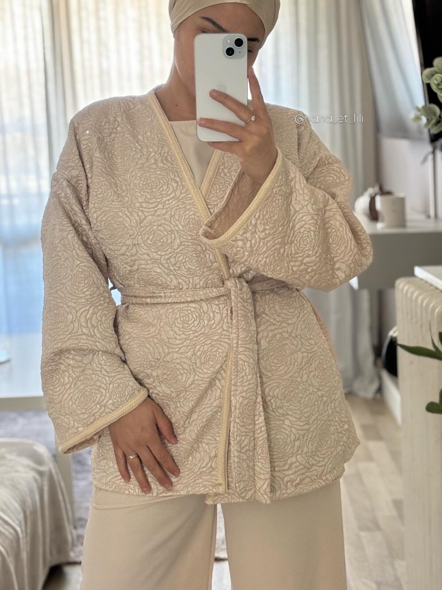 il dispose d'un pantalon évasé, d'un haut sans manches et d'un kimono avec sa ceinture